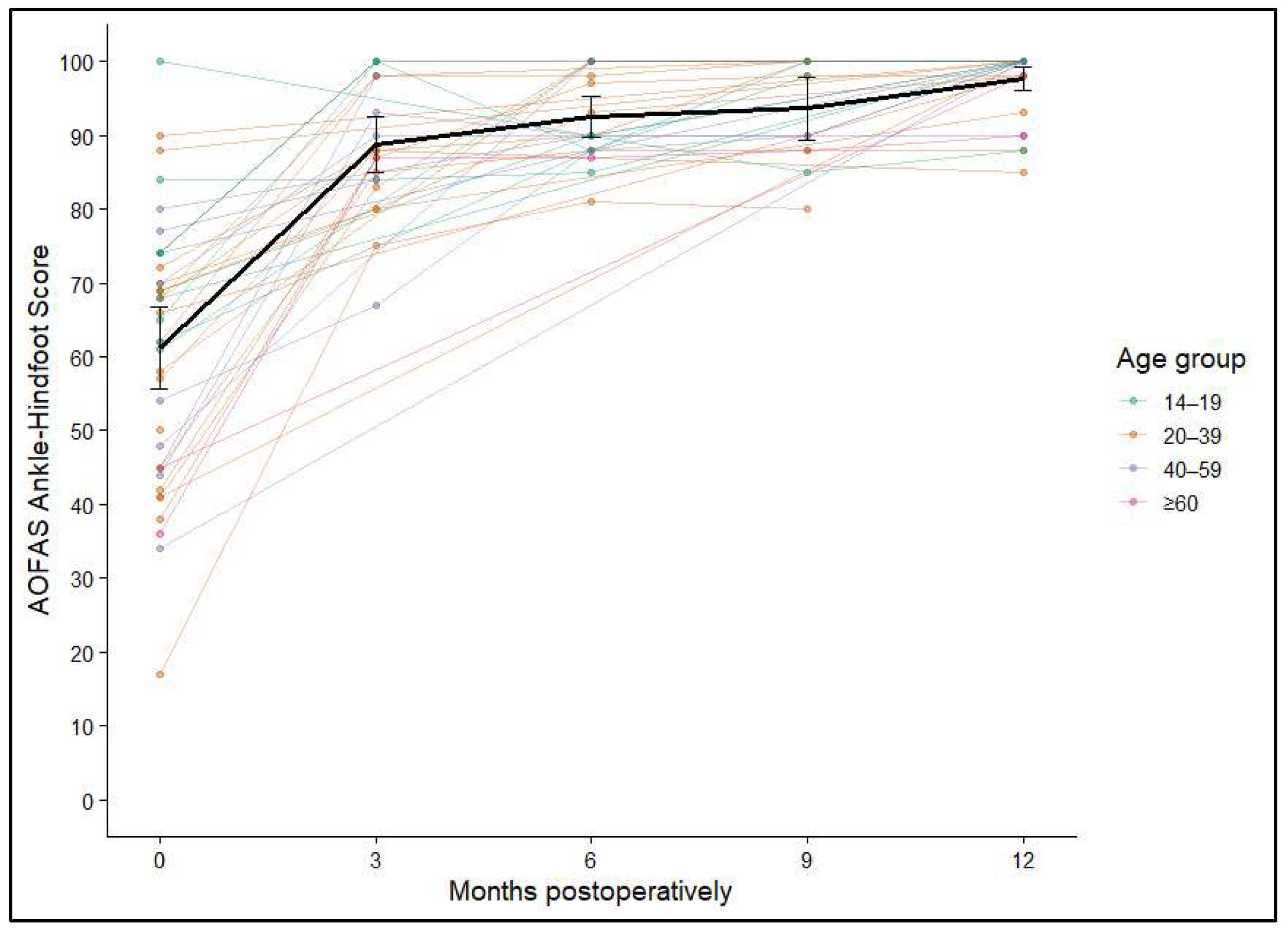 Individual AOFAS Ankle–Hindfoot Score trajectories over 12 months, stratified by age group; mean and 95% confidence intervals shown in black.