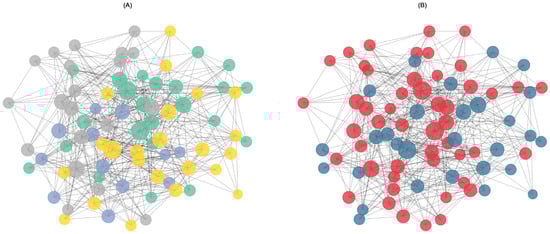 Community detection was performed using the Louvain algorithm [38], a widely used greedy optimization method for detecting communities in large networks. The algorithm operates in two iterative phases: first, each node is assigned to its own community, then nodes are iteratively moved to neighboring communities if such moves increase the network modularity Q, defined as