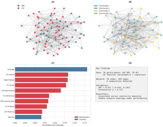 Graphical summary of the Patient Similarity Network analysis. (A) The PSN with nodes colored by diagnostic group (IBS = red, HC = blue), showing the mixing of patients across the network. (B) The same network with nodes colored by the four detected communities, illustrating how the Louvain algorithm partitions patients based on brain–cognition similarity rather than diagnosis. (C) Top 10 features contributing to network structure, with morphometric features (red, n = 8) and cognitive features (blue, n = 2) both represented corpus callosum segments, subcortical structures (pallidum, thalamus, hippocampus), and cognitive indices (Language, Visuospatial). (D) Key quantitative findings: the network comprises 78 nodes and 469 edges; community detection yielded an ARI of 0.011 with 95% confidence interval spanning zero; permutation testing confirmed non-significant correspondence with diagnosis (p = 0.212); and results were consistent across similarity measures and robust to network perturbation. Each detected community exhibited distinct brain–cognition feature profiles (Table 4), with differences in corpus callosum volumes, subcortical structures, and cognitive indices (particularly Visuospatial and memory domains) characterizing the communities. Key Findings: (1) PSN reveals 4 communities with distinct brain–cognition profiles; (2) Communities do not align with IBS/HC diagnosis (ARI ≈ 0, p = 0.21); (3) Each community shows unique patterns of brain structure and cognitive function; (4) Results robust across similarity measures and network perturbation; (5) Findings suggest brain–cognition heterogeneity cuts across diagnostic categories.