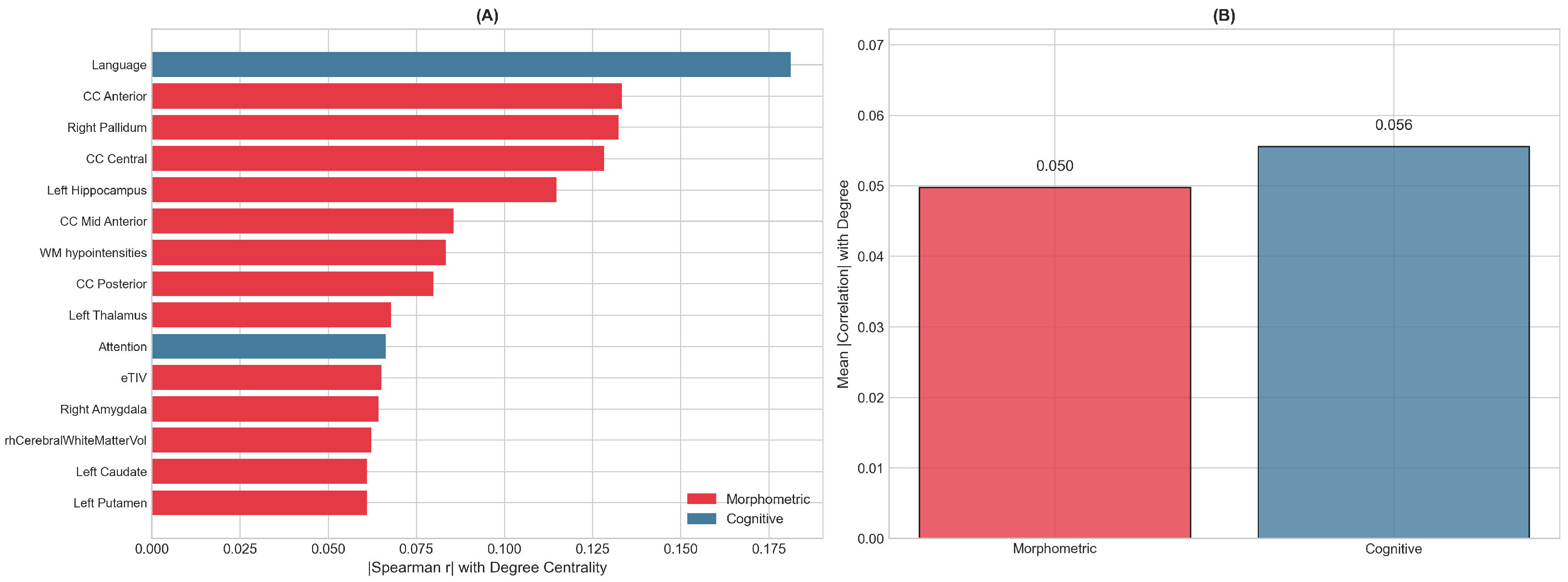 While several features showed nominally significant correlations at uncorrected , no features survived FDR correction at the 0.05 threshold, reflecting the moderate effect sizes and sample size constraints. The mean absolute correlation with degree centrality was similar for morphometric features (0.050) and cognitive features (0.056), and Mann–Whitney U testing confirmed no significant difference between feature categories (), indicating that both feature types contribute comparably to the network structure.
