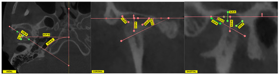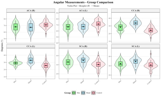 p < 0.001) (Control: 7.50 ± 1.34 mm, Maxillary: 6.02 ± 0.89 mm, Mandibular: 6.30 ± 0.83 mm), coronal condylar angle (