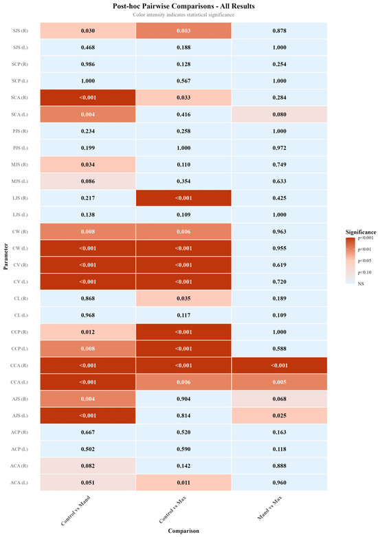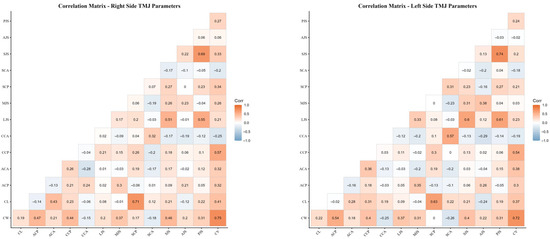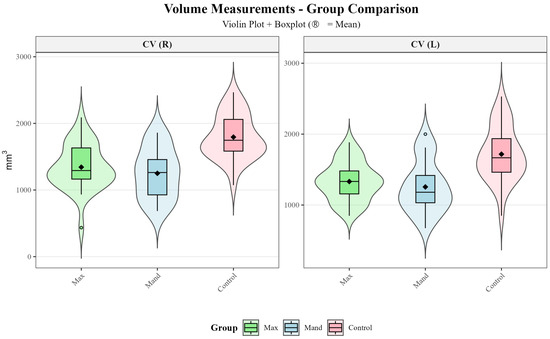 p > 0.05). Right–left side comparisons demonstrated that bilateral symmetry was largely preserved, except for condylar volume (
