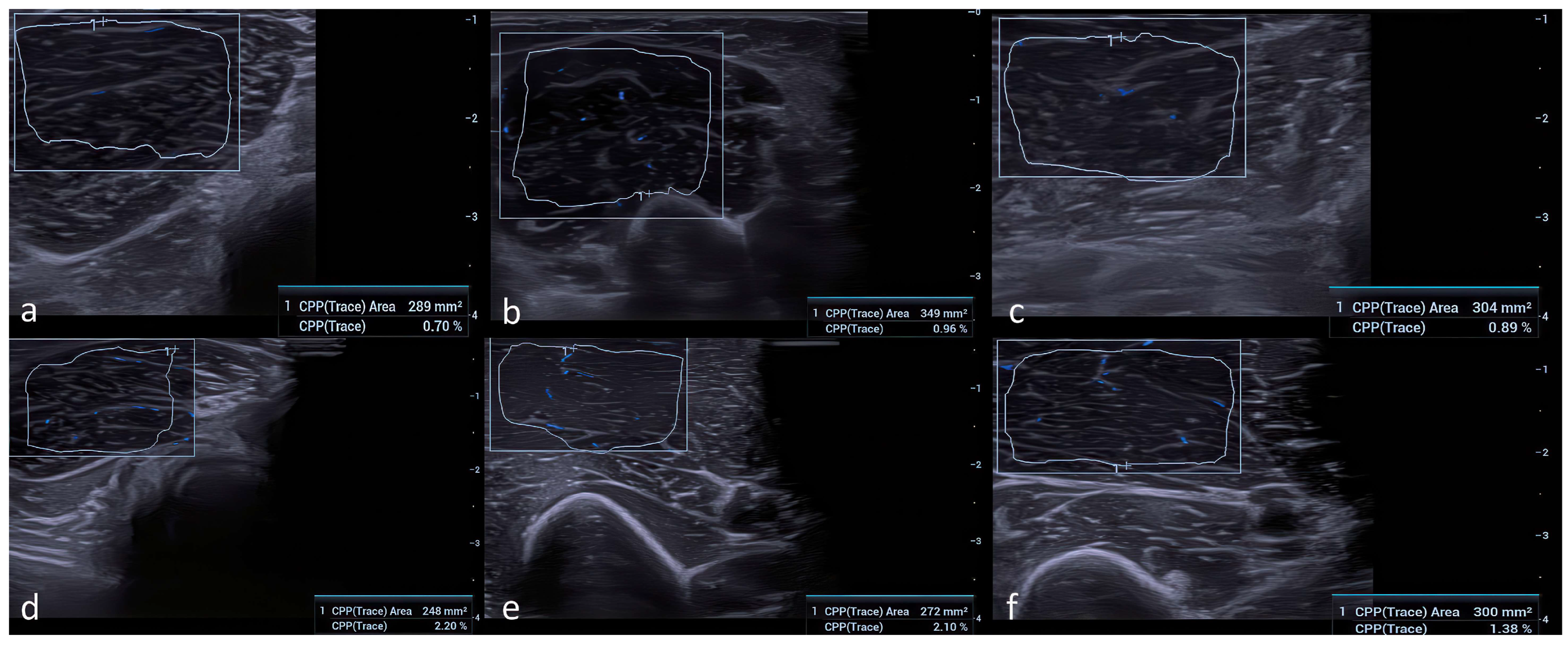 Figure 1). The vascular index (VI) was calculated as the ratio of color pixels to the total number of pixels within the selected region of interest (ROI), expressed as a percentage (VI = [color pixels/total pixels] × 100). To avoid artifacts, the ultrasound probe was held steady for 3–5 s, and VI values were recorded once UMA images stabilized. All grayscale ultrasound and UMA parameters were standardized and kept identical for all participants. UMA settings—including pulse repetition frequency (PRF), gain, frame rate, and wall filter thresholds—were held constant throughout the examinations. PRF was set at 600–800 Hz, the wall filter was set to the lowest available level, and gain was optimized to avoid blooming artifacts, ensuring that VI measurements reflected true microvascular signals rather than noise. In practice, PRF was initially set at the lowest level allowing stable signal detection and was minimally adjusted when necessary to avoid motion artifacts; all final PRF values remained within the predefined 600–800 Hz range across participants. All UMA sensitivity settings, including gain, pulse repetition frequency, and wall filter parameters, were fixed and identical across participants and muscle groups, minimizing the likelihood that technical variability or operator-dependent factors contributed to systematic inflation of vascular index measurements. To ensure measurement reproducibility, all CSA and VI measurements were performed twice and averaged. Inter- and intra-observer reliability was assessed in a randomly selected subset of 20 participants, yielding excellent agreement (ICC: 0.91–0.96 for CSA and 0.88–0.94 for VI).
