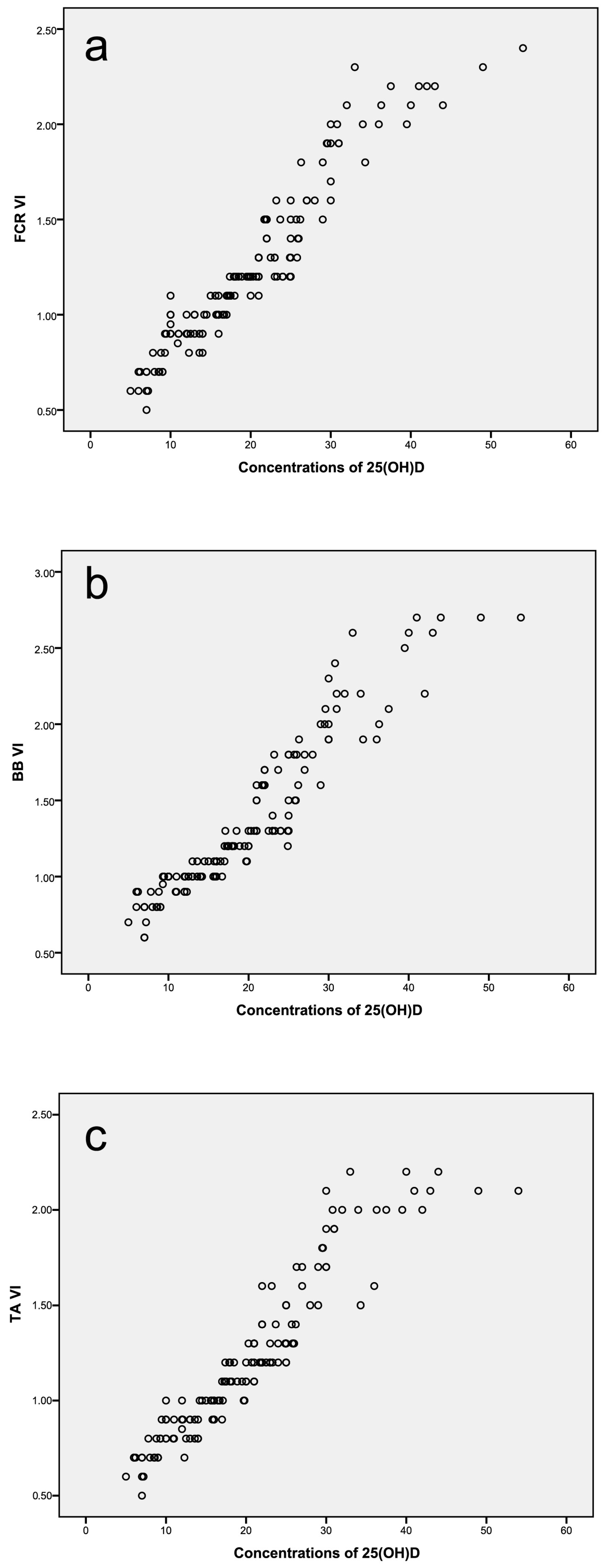 Table 3). Significant positive correlations were observed between serum 25-hydroxyvitamin D concentration and vascular index values for all examined muscles (Spearman’s ρ = 0.953 for FCR, 0.942 for BB, and 0.941 for TA; all
