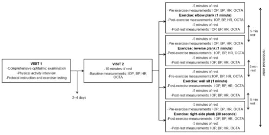 Subjects participated in the testing procedures in two separate visits, scheduled 2 to 4 days apart. In the first visit, a comprehensive ophthalmic examination was performed by an ophthalmologist, including determination of best corrected visual acuity, a slit lamp biomicroscopy, fundoscopy of the macula and optic nerve head, and intraocular pressure measurement using Perkins applanation tonometry. Subsequently, a short interview was conducted to determine participants’ level of physical activity. Participants were then familiarised with the experimental protocol and instructed on how to perform four different isometric exercises: elbow plank, right-side plank, reverse plank, and wall sit (Figure 1). Participants were assessed for eligibility to perform the exercises, and if no exclusion criteria were met, the second visit was scheduled. During the second visit, participants were first asked to rest for 10 min, after which baseline measurements were obtained. The sequence of parameter measurements was fixed: intraocular pressure (IOP) was measured first, followed by systemic blood pressure (BP) and heart rate (HR), and finally OCT angiography of macula and optic nerve head. Subsequently, the experimental protocol was conducted, consisting of four measurement sessions which included four different isometric exercises. Each measurement session followed a structured sequence that was applied consistently across all sessions. At the beginning of each measurement session, participants underwent a five-minute resting period, after which pre-exercise values of parameters were recorded. Participants then performed the exercise, and measurements were obtained immediately after its completion following the same protocol as at baseline. This was followed by a five-minute period of seated rest, after which the same measurements were repeated. Between each measurement session, an additional five-minute rest period was provided for muscular recovery. This additional period of rest also ensured that all measured parameters returned to baseline values prior to the next exercise. The elbow plank, reverse plank, and wall sit were performed for one minute, and the right-side plank was performed for 30 s. The right-side plank was performed for a shorter duration compared to other exercises because of its higher perceived intensity and unilateral load. This adjustment was made to ensure participants complete the exercise with proper form. The order of the measurement sessions was randomised to avoid order bias. The Valsalva manoeuvre was not permitted due to its possible interference with intraocular pressure and retinal vessel density [23,24]. All ocular parameters were measured exclusively on the right eye of each participant, as inter-eye differences were expected to be minimal in healthy participants with no ocular disease. The right eye was chosen for measurements across all participants to ensure methodological consistency, as there was no clinical indication for preference of either eye. This protocol was applied to each of the study-defined exercises (Figure 2).