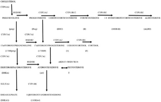 - Schiffer, L.; Barnard, L.; Baranowski, E.S.; Gilligan, L.C.; Taylor, A.E.; Arlt, W.; Shackleton, C.H.L.; Storbeck, K.H. Human steroid biosynthesis, metabolism and excretion are differentially reflected by serum and urine steroid metabolomes: A comprehensive review. J. Steroid Biochem. Mol. Biol. 2019, 194, 105439. [Google Scholar] [CrossRef] [PubMed] [PubMed Central]