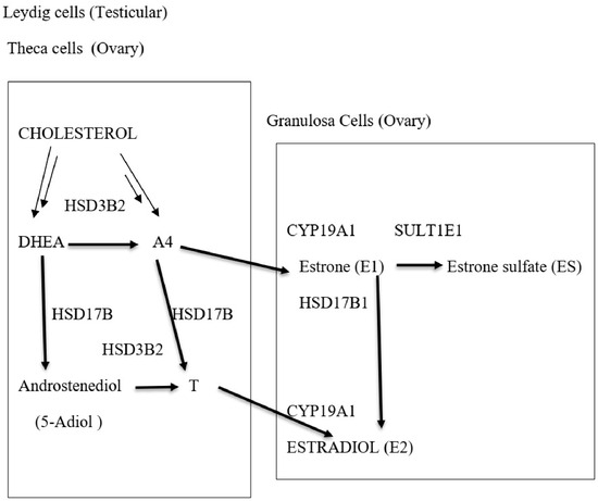 In the Leydig cells of the testis, in the absence of SULT2A1, the major sulfotransferase, DHEA, is converted into testosterone through androstenedione and androstenediol. Testicular androgen output in the testis is mainly testosterone with lower levels of A4 and DHEA [10]. The pathway for ovarian synthesis of testosterone is similar to that of the testis. Androgen and androgen precursor production by the ovary follows a similar route to that of the testes. Ovarian steroidogenesis in the theca cells results in the production of A4 and testosterone, which enter the granulosa cells where CYP19A1 (aromatase) converts testosterone into oestrogens (Figure 2) [11].