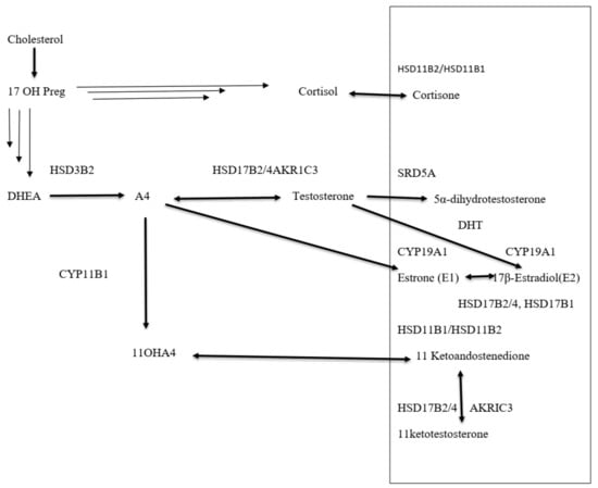 11OHA4 is converted in peripheral tissues into 11-ketotestosterone (11KT), which is a potent androgen (Figure 5). 11 keto-5α dihydrotestosterone (11KDHT) has similar androgenic activity to DHT though its circulating levels are significantly lower than that of DHT [17]. 11-oxyandrogens have been shown to contribute to disorders of adrenal excess, such as congenital adrenal hyperplasia, premature adrenarche, polycystic ovary syndrome, as well as castration-resistant prostate cancer [18].