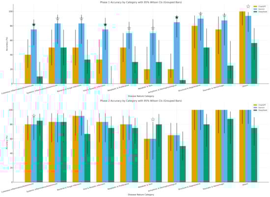 Phase-wise accuracy by category with 95% CIs (grouped bars). Phase-wise (Phase 1 top; Phase 2 bottom) per-category diagnostic accuracy for ChatGPT, Gemini, and DeepSeek on 138 images across 10 disease nature categories. Bars show % correct with Wilson 95% CIs. A solid star (★) marks a single highest model whose lead over the next best is statistically significant (Newcombe 95% CI for the difference excludes 0). A white/hollow star (☆) indicates the model is highest but not significant; ties have no star.