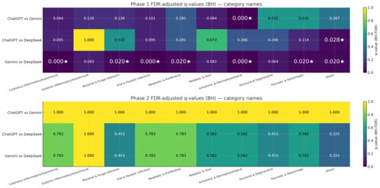 Pairwise significance after multiple-testing correction (FDR heatmaps). False discovery rate (FDR)-adjusted q-values (Benjamini–Hochberg) for pairwise model comparisons across categories in Phase 1 (top) and Phase 2 (bottom). Rows correspond to ChatGPT vs. Gemini, ChatGPT vs. DeepSeek, and Gemini vs. DeepSeek; columns are the 10 categories. Cell values are q-values (darker = smaller), with a white star (★) marking q < 0.05. This panel answers where model differences are statistically credible after controlling for multiplicity.