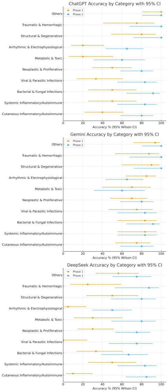 Per-model accuracy by category with 95% Wilson Cis are shown as dot-whisker plots for (left-to-right) ChatGPT, Gemini, and DeepSeek. For each category, markers display Phase 1 and Phase 2 side-by-side, enabling a direct visual of within-model improvements and remaining variability across categories.