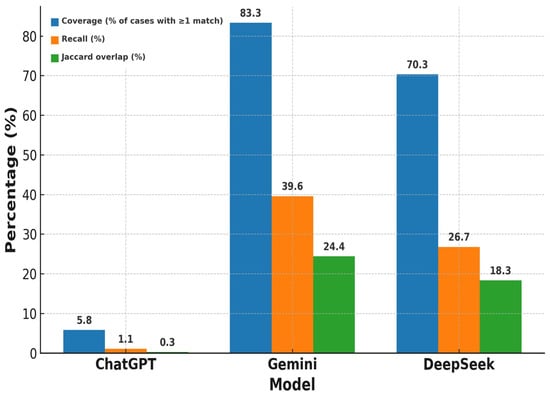 For Phase 2 only, differential diagnosis precision (percentage overlap with differential diagnosis mentioned in the book) is summarized in Table 4 with categorization as per organ system. The precision varied widely across all three AI models in general. ChatGPT averaged 6.99% (median 6.47%; range 0.0–21.42%), significantly lower than Gemini at 36.39% (median 37.5%; range 0.0–92.85%) and DeepSeek at 32.74% (median 33.33%; range 0.0–87.5%). This divergence from ChatGPT’s high Phase 2 top-1 accuracy reflects that top-1 scoring applied clinician-curated normalization for trivial label variants, whereas differential agreement was evaluated as strict term overlap against the textbook list (order ignored), which is more sensitive to lexical choices and brief lists. Gemini and DeepSeek consistently outperformed ChatGPT in some categories. In microscopy (urine/synovial fluid) cases, Gemini achieved 45% and DeepSeek achieved 50%, while ChatGPT scored just 7.74%. For papulosquamous skin photos, Gemini scored 43.75% and DeepSeek 37.49%, compared with ChatGPT’s 10.49%. The ranges showed differences with Gemini peaking at 92.85% in ocular photographs and DeepSeek at 87.5% in papulosquamous skin photos, while ChatGPT topped out at 21.42% in ECG cases. The set-based summaries of the Phase 2 differential diagnoses are shown in Figure 4. Under our matching criteria, at least one textbook differential term appeared in only 5.8% of cases for ChatGPT (8/138), but in 83.3% and 70.3% of cases for Gemini and DeepSeek, respectively. Mean recall of the textbook differential list was 1.1% for ChatGPT, 39.6% for Gemini, and 26.7% for DeepSeek, with corresponding mean Jaccard overlaps of 0.26%, 24.4%, and 18.3%, respectively.