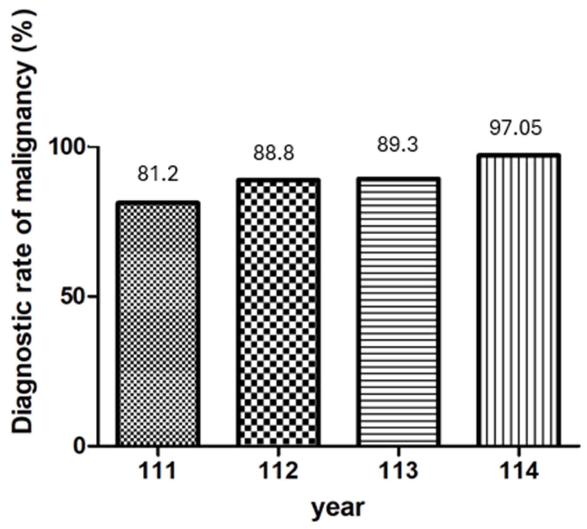 3.5. Annual Trends in the Diagnostic Rate of Malignancy of EUS-FNB According to the Number of Needle Passes