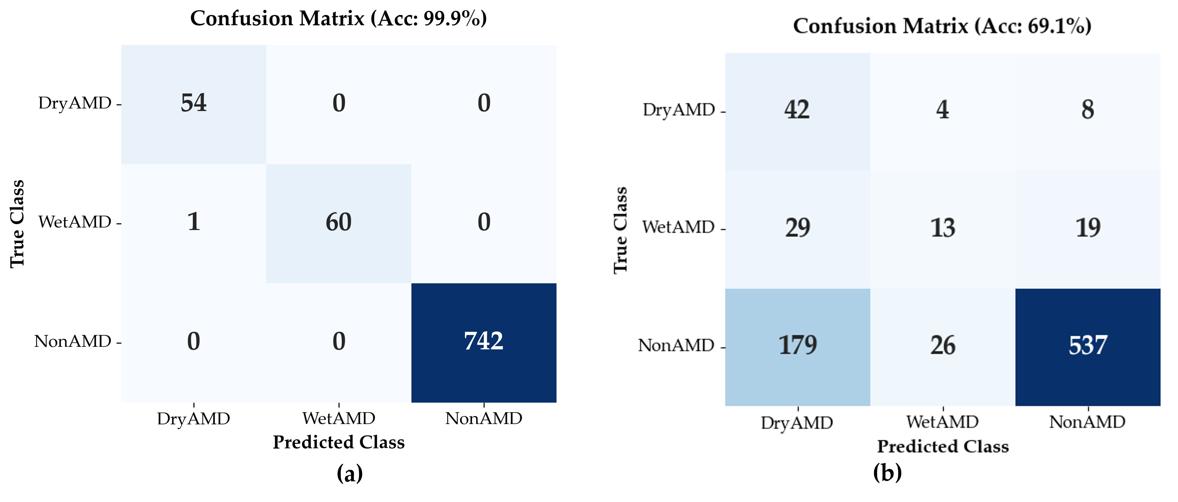 Here, the NonAMD category encompasses both normal eyes and other non-AMD retinal conditions. Accordingly, these results primarily reflect the system’s ability to distinguish AMD from non-AMD presentations in a screening-oriented setting, rather than fine-grained discrimination among heterogeneous non-AMD pathologies.