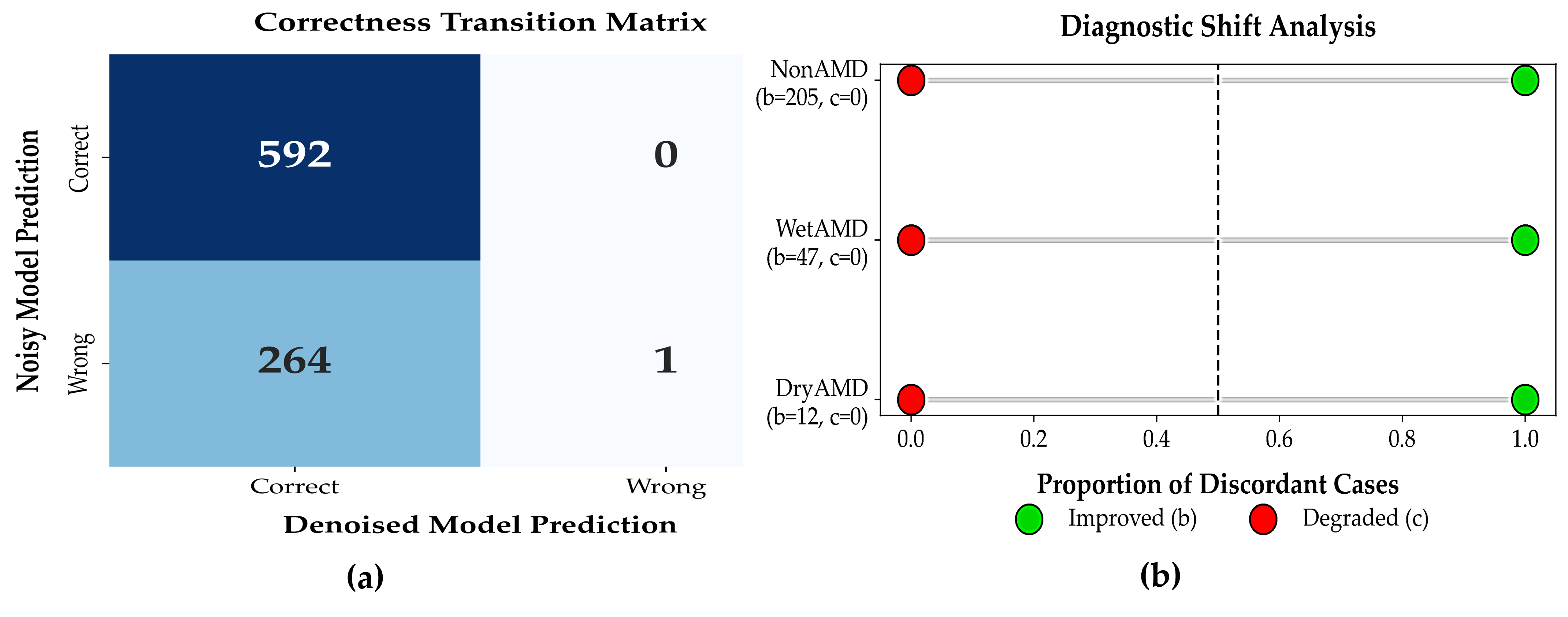 Figure 6a. Forest plot showing proportions of improved and degraded diagnoses after denoising. All discordant cases favored improvement, with no observed degradation as shown in