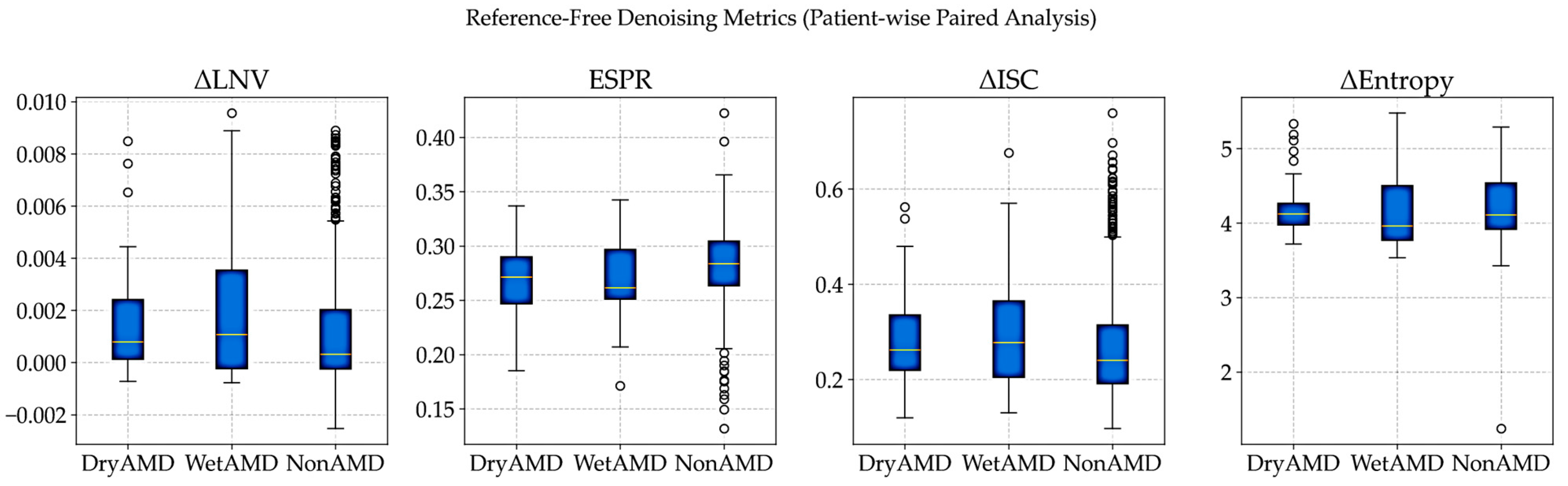 All metrics were computed per patient and then aggregated class-wise for DryAMD, WetAMD, and NonAMD cohorts. Class-wise mean reference-free denoising metrics are summarized in