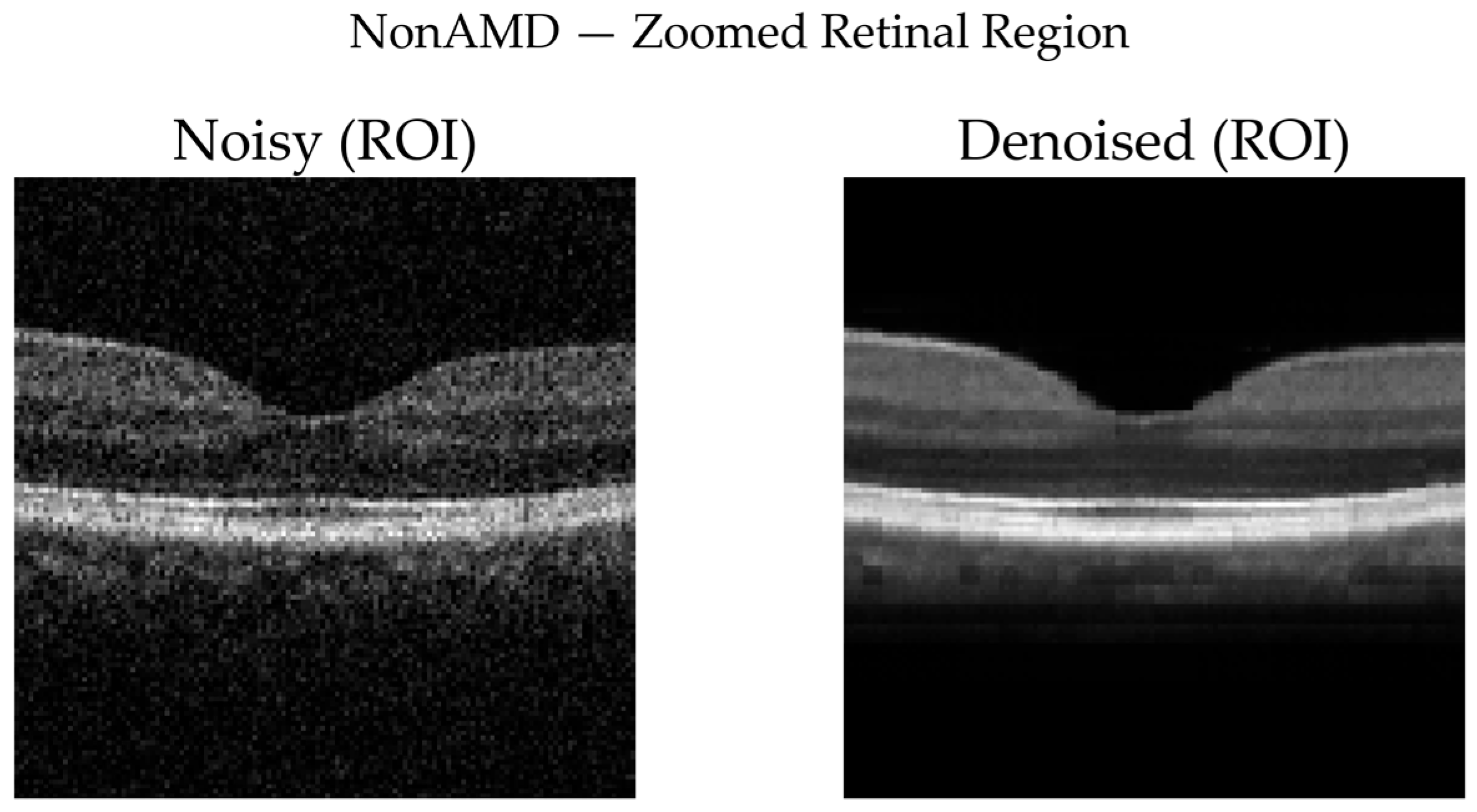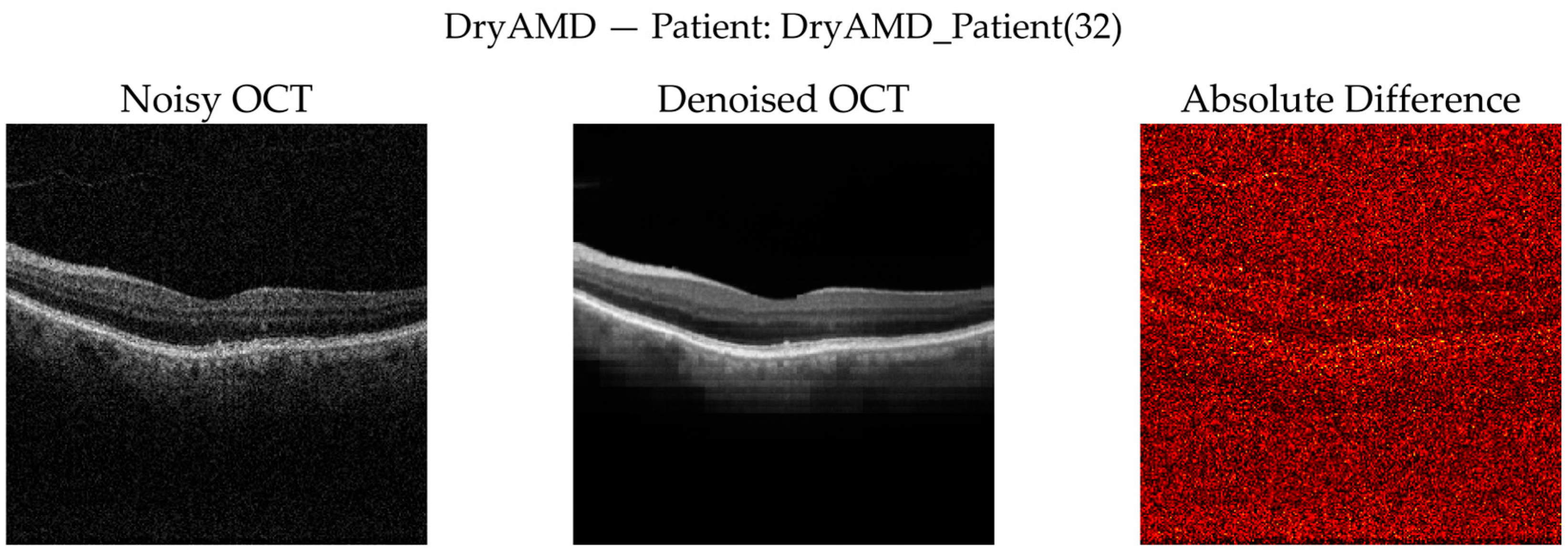 Figure 11 show that denoising reduces speckle noise and improves layer uniformity while preserving normal foveal contour and retinal thickness. Difference maps indicate that changes are primarily noise-related rather than structural.