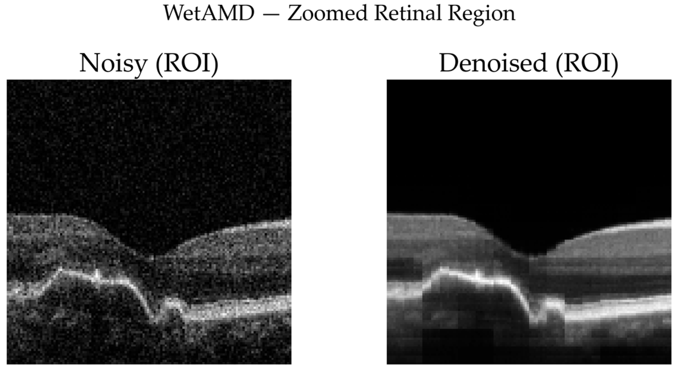 Figure 12) represent the most challenging scenario due to the presence of highly reflective lesions, fluid accumulations, and shadowing artifacts. Despite these complexities, the denoised image retains critical pathological features such as hyperreflective regions and subretinal fluid contours, while substantially reducing background speckle.