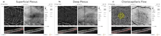 After a comprehensive ophthalmologic examination, OCTA (AngioVue, Optovue, Fremont, CA, USA) evaluation was performed. The device automatically calculated parameters, including foveal avascular zone (FAZ), FAZ perimeter, foveal vessel density, subfoveal and peri-parafoveal vessel density (superficial and deep capillary plexus in four quadrants), outer retina, and choriocapillaris flow [outer retina (OR) flow- choriocapillaris (CC) flow]. Segmentation errors were reviewed and manually corrected by trained retinal specialists (MO, AA), blinded to group assignment. Only scans with signal strength ≥ 7/10 and without significant motion artifacts were included in the analysis. Representative en face images demonstrating segmentation of superficial and deep capillary plexuses, as well as choriocapillaris flow, are shown in Figure 1.