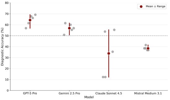 Overall diagnostic accuracy differed substantially between models (Table 1, Figure 1). GPT-5 Pro achieved the highest mean accuracy (64.3%), followed by Gemini 2.5 Pro (56.9%). Mistral Medium 3.1 (38.5%) and Claude Sonnet 4.5 (33.8%) demonstrated markedly lower performance.
