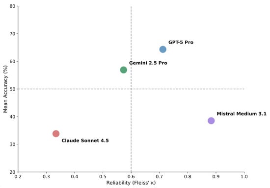 Accuracy–consistency dissociation matrix. Models are plotted according to mean diagnostic accuracy (y-axis) and inter-run reliability measured by Fleiss’ κ (x-axis). Dashed lines indicate proposed thresholds: 50% accuracy (horizontal) and κ = 0.60 corresponding to substantial agreement (vertical). The resulting quadrants characterize distinct behavioral profiles: upper-right (high accuracy, high consistency) represents ideal performance; upper-left (high accuracy, low consistency) suggests potential for improvement through consensus methods; lower-right (low accuracy, high consistency) indicates systematic error; lower-left (low accuracy, low consistency) reflects unstable diagnostic behavior.