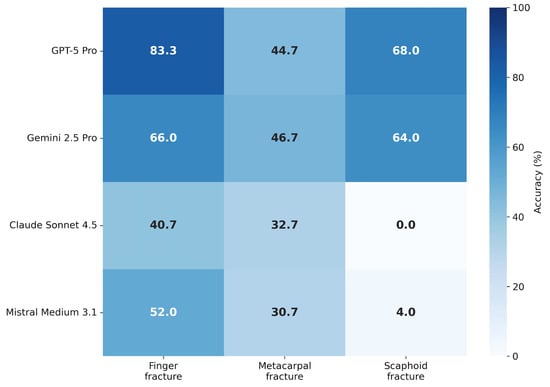 Scaphoid fractures (n = 5) represented the most difficult subgroup. While GPT-5 Pro and Gemini 2.5 Pro achieved moderate performance (68.0% and 64.0%, respectively), Claude Sonnet 4.5 failed entirely (0.0% accuracy across all runs), and Mistral Medium 3.1 achieved only 4.0%.