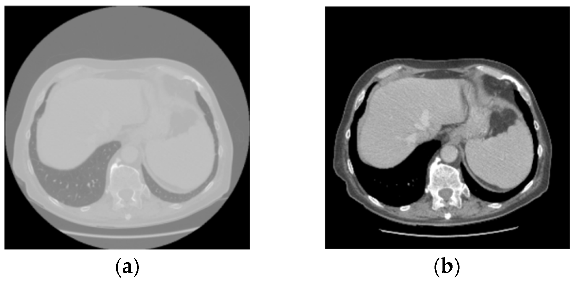 Figure 1. CT image processing performed to enhance the visibility of the liver and tumor regions by normalizing the Hounsfield Unit values to the range of −250 to 250: (a) the original CT slice; (b) the enhanced CT slice.