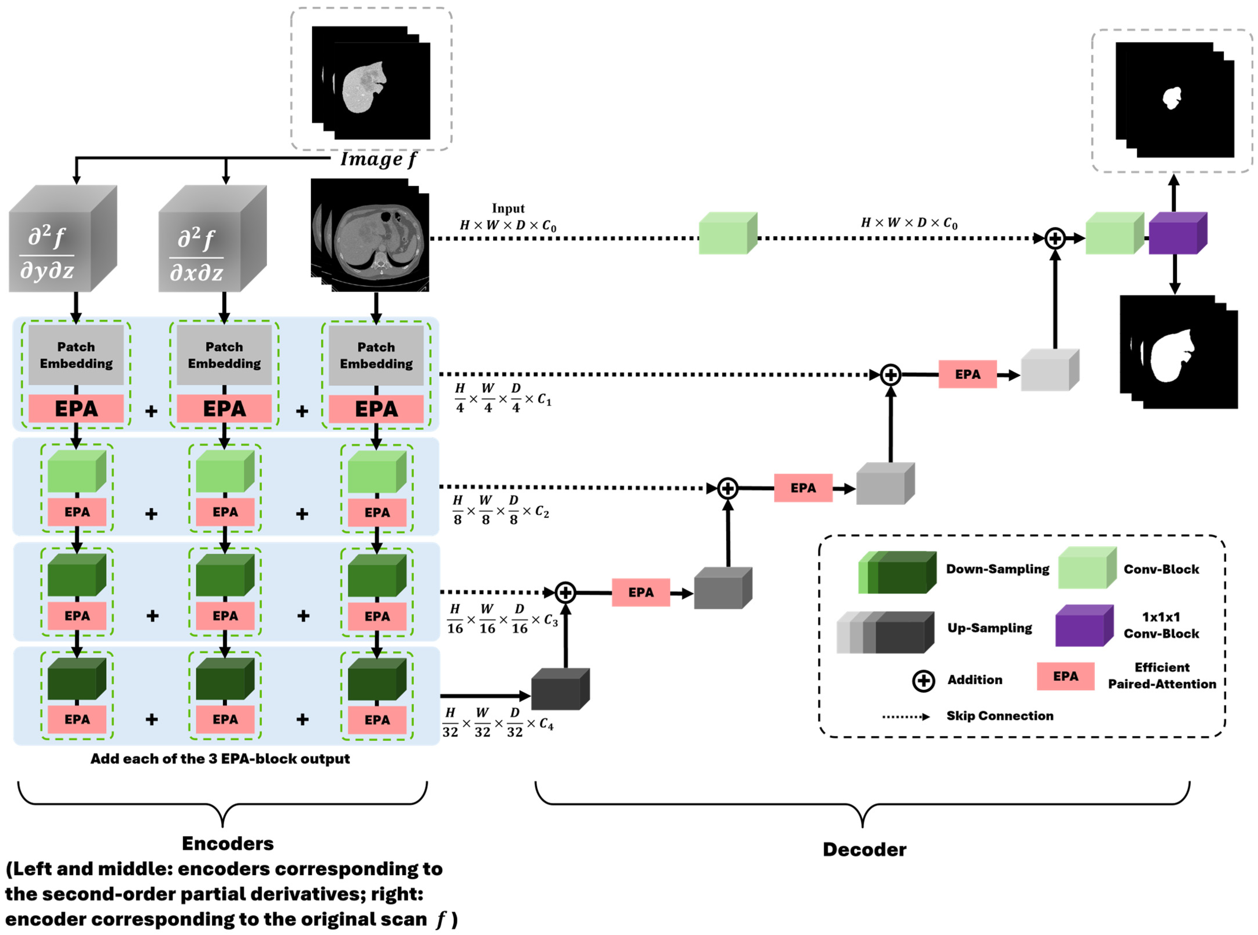 Figure 2 shows the overall pipeline of liver tumor segmentation based on our G-UNETR++ model. First, the liver is segmented from CT images using G-UNETR++. Then the extracted liver region is multiplied with the original CT images to exclude non-liver regions. Lastly, liver tumors are delineated from the liver-only CT images using G-UNETR++. Figure 3 shows the architecture of our G-UNETR++ model. The model consists of a hierarchical encoder–decoder structure with skip connections between the encoder and the decoder, efficient paired attention (EPA) blocks, and convolutional blocks to obtain segmentation results. The encoder scheme consists of three 4-stage encoders in parallel one with CT scan f ( x , y , z ) as input, and the other two with second-order partial derivatives 2 f ( x , y , z ) x z and 2 f ( x , y , z ) y z as their inputs to learn 3D geometric features such as the boundaries between different organs and tissues especially along the z-axis. In the first stage, patch embedding is performed, where the input volume f R H × W × D is divided into non-overlapping 3D patches f p R N × ( P 1 ,   P 2 ,   P 3 ) of size (P1, P2, P3), producing a sequence with length N = ( H P 1 × W P 2 × D P 3 ) . These patches are projected into C 1 channels to form a H P 1 × W P 2 × D P 3 × C 1 feature map, using a patch resolution of (4, 4, 2), followed by an EPA block. The remaining stages downsample the feature maps by a factor of two using non-overlapping convolutions, each followed by an EPA block. At every stage, features from the three encoders are fused via element-wise summation. The EPA block employs spatial and channel attention with shared keys and queries and separate value projections to jointly model spatial–channel features [27]. The decoder consists of four stages with deconvolution-based upsampling to progressively increase resolution. EPA blocks are used at all but the final stage. Skip connections fuse encoder and decoder features at each scale to recover spatial information, while channel dimensions are halved between stages. In the final stage, fused features are passed through 3 × 3 × 3 and 1 × 1 × 1 convolutions to generate voxel-wise segmentation outputs.