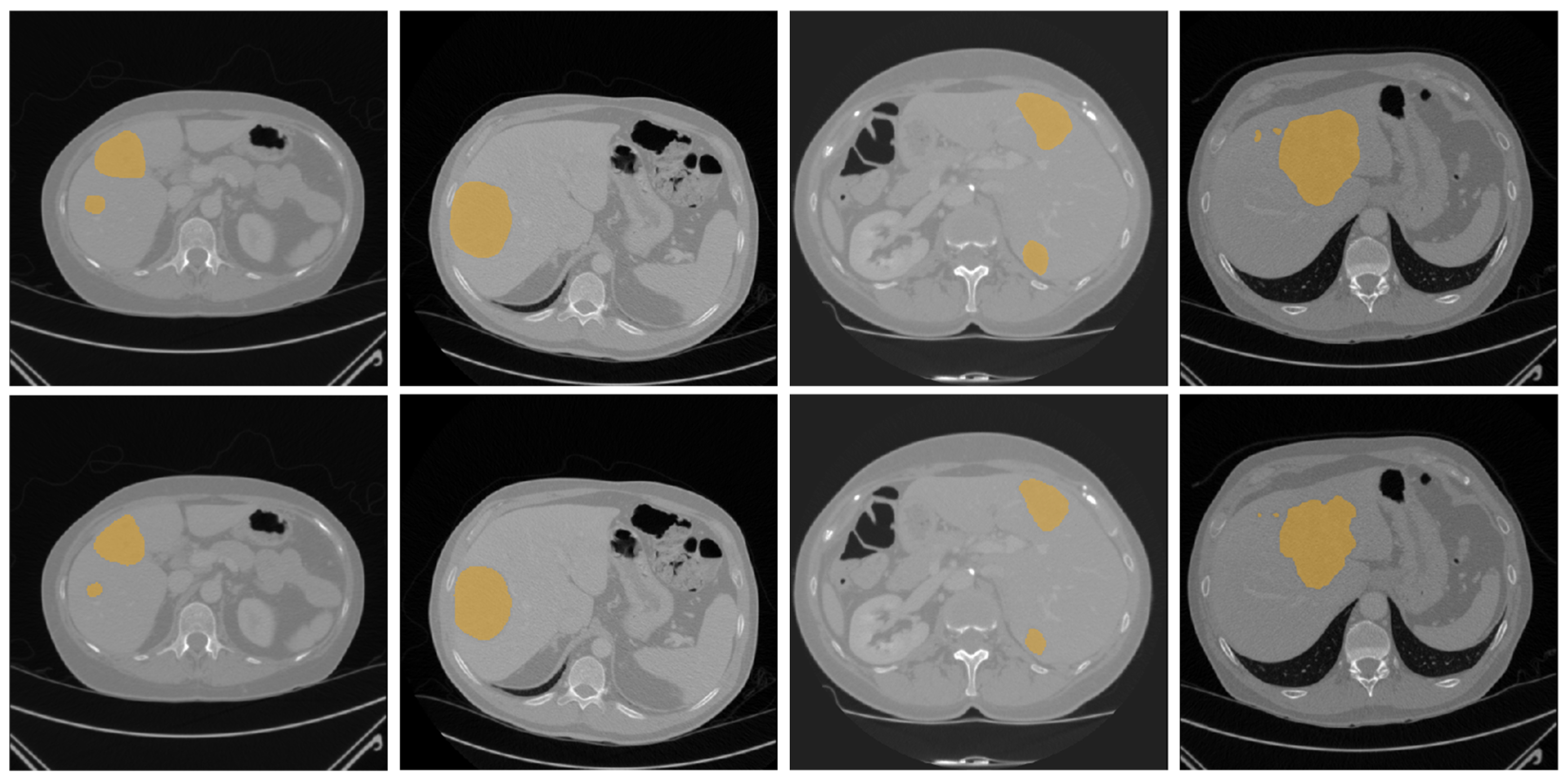 Figure 5. Examples of tumor segmentation results of the proposed model over the 3DIRCADb dataset. Upper: the ground truth; bottom: the predicted tumor regions.
