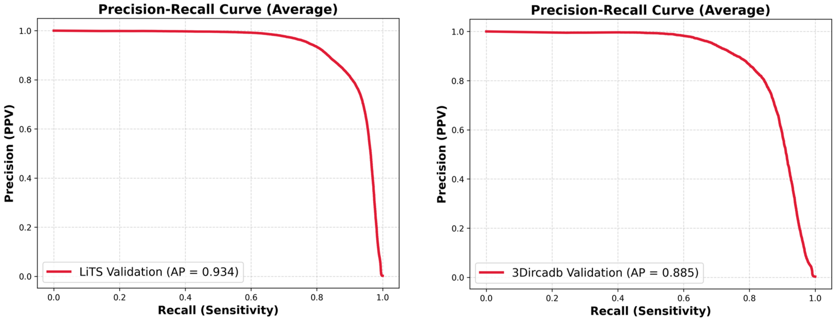 Figure 8. Precision-recall plotting for liver tumor segmentation over the LiTS dataset (left) and the 3DIRCADb dataset (right).