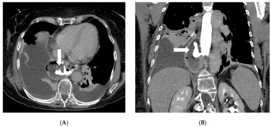 Axial (A) and coronal (B) post-contrast CT scans in a patient on postoperative day 3 following gastric bypass with esophagojejunostomy positioned in the mediastinum (history of sleeve gastrectomy). An esophagojejunal feeding tube is in place. To the right of the esophagojejunal anastomosis, a hypodense collection with internal air components is visible. After oral administration of water-soluble contrast, a posterior dehiscence of the anastomosis is demonstrated, with extraluminal contrast leakage accumulating within the previously described collection (arrows). The copyright of this figure belongs to the authors.