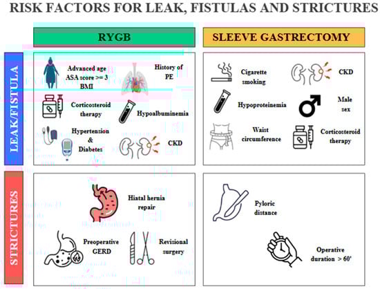 Anastomotic or staple-line leaks are a rare but potentially life-threatening complication following bariatric surgery, particularly after SG and RYGB. Although the incidence of postoperative gastrointestinal leaks has declined over time, it remains a relatively rare complication associated with considerable morbidity and mortality [47]. The overall incidence of anastomotic leaks after bariatric surgery is reported to range between 1% and 6%. The incidence of leaks following RYGB has been reported to be as high as 8.3%; however, more recent data indicate a rate closer to 1.1% [48]. In comparison, the incidence of leaks or fistulas after SG is estimated to occur in approximately 2% to 5% of cases [49,50]. The overall mortality rate related to leaks in RYGB is relatively low, at 0.6%. However, the mortality specifically among patients who experience a leak is significantly higher, ranging from 14.7% to 17% [51]. Similar patterns are observed in SG, where the overall leak-related mortality of 0.14% and a leak-associated mortality rate of 9% [52]. These leaks most commonly occur at the proximal staple line just below the angle of His in SG, and at the gastrojejunal (GJ) anastomosis in RYGB [53]. In SG, to avoid stapling too close to the esophagus, surgeons may intentionally leave a small fundal pouch which may predispose to ischemia due to division of the short gastric arteries. Additional contributing factors include inappropriate staple height selection owing to the thin gastric wall in the fundus, downstream stenosis at the incisura angularis, and elevated intraluminal pressure within a noncompliant gastric sleeve [17,54]. As a result, most leaks are not present at the conclusion of the procedure but tend to manifest in the ensuing weeks, frequently in association with distal obstruction. Gastrointestinal leaks occurring within the first 48 h after surgery are typically linked to mechanical factors, such as technical issues during the procedure. In contrast, leaks that arise more than 5–6 days postoperatively are more often attributed to ischemic mechanisms [55,56]. According to the Rosenthal classification, leaks are categorized based on the time of onset into acute (≤1 week), early (1–6 weeks), late (6–12 weeks), and chronic (>12 weeks), a framework that aids in guiding diagnostic and therapeutic strategies [57]. An alternative classification of leaks following SG is based on their location and severity. Type I, or subclinical leaks, are confined and do not present with sepsis or extension into the abdominal or pleural cavities. In contrast, type II leaks, referred to as clinical, are associated with septic symptoms and extensive spread within the abdominal or pleural spaces [58,59]. Several studies have investigated the predictive factors for anastomotic leaks following RYGB. An analysis based on the large MBSAQIP database identified numerous independent preoperative risk factors [60]. Among these, a high body mass index (BMI), advanced age, an ASA score ≥ 3, a history of pulmonary embolism, and a partially dependent functional status were significantly associated with an increased risk of leak. Conversely, higher preoperative albumin levels, indicative of better nutritional status, and longer operative duration, likely reflecting greater technical precision, were identified as protective factors against the occurrence of postoperative complications [60]. Another study confirmed and expanded on these findings, highlighting additional risk factors including comorbidities such as obstructive sleep apnea, hypertension, diabetes mellitus, and hypoalbuminemia [61] (Figure 3). Interestingly, certain intraoperative practices, such as the use of provocative tests to assess anastomotic integrity and the placement of surgical drains, were associated with an increased incidence of fistulas. In contrast, the implementation of a postoperative swallow study showed no significant impact on the early detection of leaks [61]. Clinically, early recognition of leaks remains essential. Symptoms such as persistent tachycardia (heart rate > 90 bpm), fever, increased intravenous fluid requirements, and a rapid rise in C-reactive protein (CRP) levels from as early as postoperative day two are considered reliable warning signs. In some cases, these clinical indicators may precede radiological evidence, underscoring the importance of careful clinical monitoring in the days following surgery [60]. Regarding SG, male sex, elevated waist circumference, hypoproteinemia, and type 2 diabetes have been recognized as risk factors for postoperative leaks (Figure 1). Preventing acute leaks requires optimization of the surgical technique, specifically through meticulous dissection of the angle of His and conserving a smaller segment of the gastric fundus [62]. A recent meta-analysis identified several significant risk factors for the development of postoperative leaks following SG and RYGB [63]. Cigarette smoking was associated with an increased risk of leaks in SG patients, with an odds ratio (OR) of 1.71 [1.44, 2.05], whereas in RYGB patients the risk increase was less pronounced and not statistically significant (OR 1.09 [0.82, 1.42]). When combining both procedures, the overall risk remained elevated (OR 1.31 [1.06, 1.61]) [63]. DM did not significantly increase leak risk after SG (OR 1.11 [0.97, 1.28]), but a significant effect was observed in RYGB patients (OR 1.33 [1.02, 1.73]); combining data from both procedures yielded an OR of 1.19 [1.11, 1.28]. Hypertension, initially not associated with increased risk, was subsequently identified as a moderate risk factor with a risk ratio of 1.17 [1.10, 1.24]. The most prominent risk factor was chronic kidney disease (CKD), which conferred a significantly increased risk of leak, with an OR of 2.41 [1.42, 3.99]. Finally, chronic corticosteroid therapy was also associated with an increased risk of postoperative leaks (OR 1.57 [1.22, 2.02]) [63] (Figure 1).