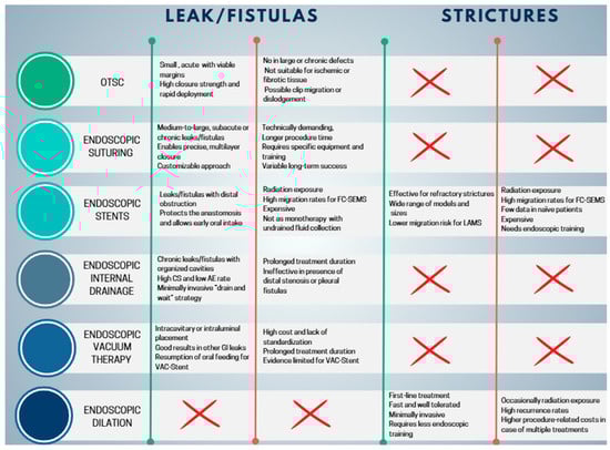 Future perspectives include the development of hybrid devices such as the VAC-Stent, the optimization of sequential multimodal strategies, and the use of artificial intelligence to enhance early diagnosis and patient stratification. Overall, endoscopic management of post-bariatric complications should no longer be regarded as a rescue option but as a structured, multidisciplinary component of care, with the potential to substantially improve survival and quality of life. Figure 8 provides an overview of the main benefits and limitations of endoscopic interventions for the management of postoperative leaks, fistulas, and strictures after bariatric surgery (Figure 8).