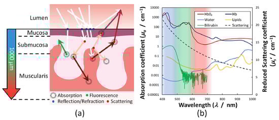 Specifically, when light illuminates multi-layered bowel tissue (see Figure 1a), it is partially reflected at the surface interfaces with refractive index mismatches, and penetrates into the tissue, where processes of scattering and absorption may occur. Through multiple scattering events, a fraction of this light eventually re-emerges and can be measured for various diagnostic techniques. Moreover, some molecules may also exhibit autofluorescence, which will be described in the following chapters. To characterize light absorption in tissues where it significantly dominates over scattering, the Bouguer–Beer–Lambert law provides an accurate model for light attenuation [49]: