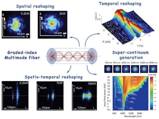 - Krupa, K.; Louot, C.; Couderc, V.; Fabert, M.; Guénard, R.; Shalaby, B.; Tonello, A.; Pagnoux, D.; Leproux, P.; Bendahmane, A.; et al. Spatiotemporal characterization of supercontinuum extending from the visible to the mid-infrared in a multimode graded-index optical fiber. Opt. Lett. 2016, 41, 5785–5788. [Google Scholar] [CrossRef] [PubMed]