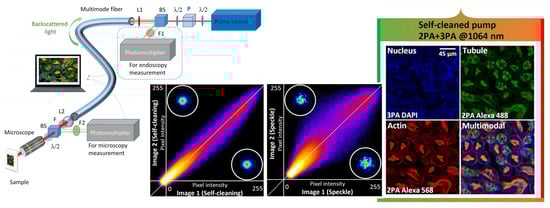 The spatiotemporal characteristics of beam self-cleaning, combined with the accompanying increase in peak pulse power and supercontinuum generation (see Figure 5), open the way for important improvements in nonlinear imaging processes. These include the integration of multiphoton fluorescence with second- and third-harmonics, as well as coherent Raman-based processes such as CARS or stimulated Raman scattering (SRS) [47,137,146]. This novel concept could be based on the nonlinear response of the GRIN MM fiber medium to the propagation of high-peak-power optical pulses in combination with precise control of the input laser beam coupling conditions. Experiments performed by the teams of S. Wabnitz, V. Couderc, and M. Papi have shown that self-cleaning can lead to a significant improvement in the resolution of multispectral multiphoton fluorescence and M-CARS images. This improvement is observed in both microscopy and endoscopy when using GRIN MM fibers to deliver the laser beam to the specimen/sample [47,137,146]. To evaluate the advantages of the described imaging system, 2D and 3D spatial resolutions were determined. For example, a “clean” beam at a 1064 nm wavelength provides a transverse and longitudinal resolution of 0.66 µm and 3.1 µm, respectively. This represents a significant improvement over the linear MM mode of operation, in which multiple focal points caused by the chaotic shape of the initial speckle beam significantly degrade spatial resolution beyond 1.5 µm.