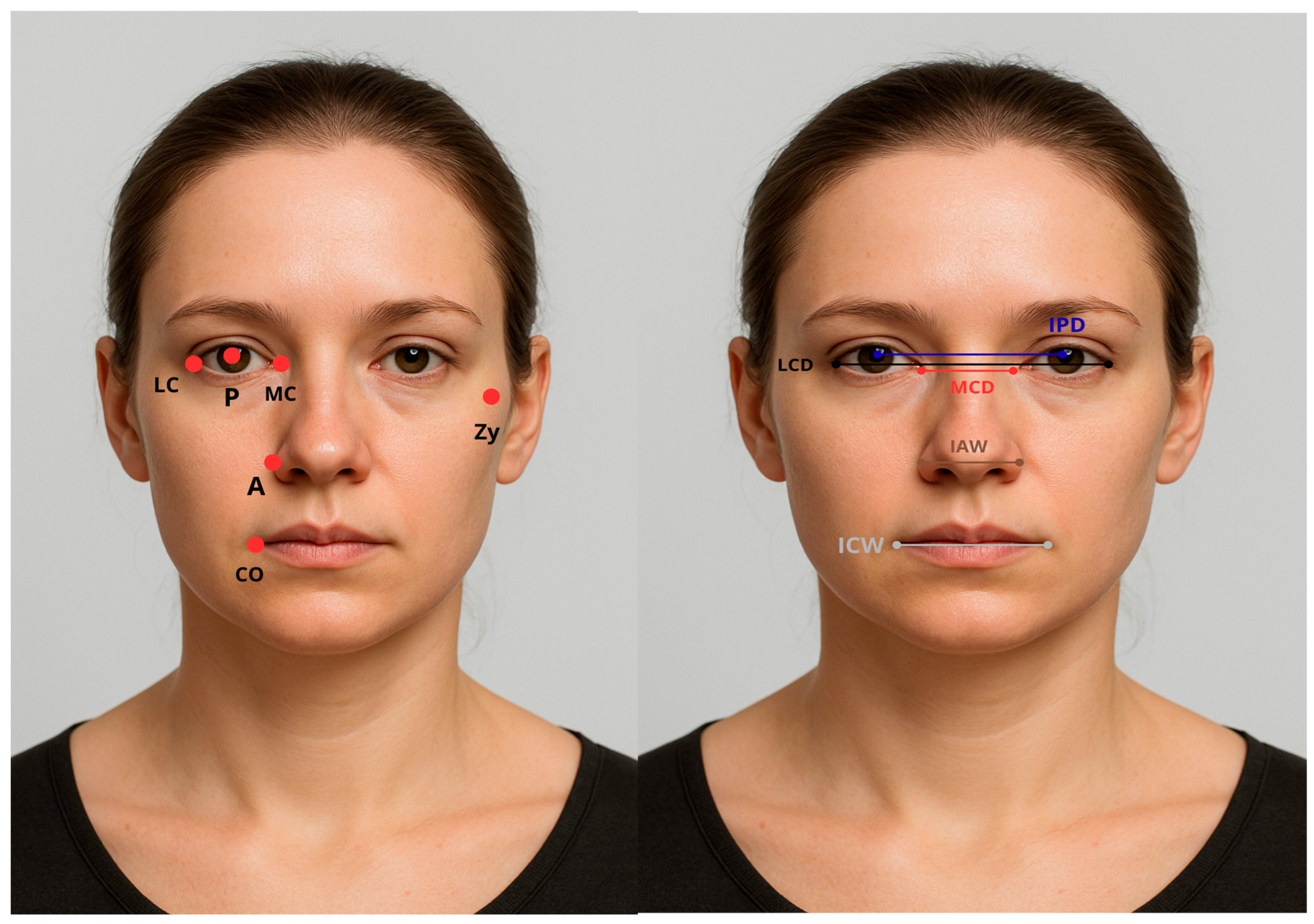 - Eltahir, M.A.; Alnasser, I.; Aljaber, S. Interpupillary and Intercanthal Distance Values among Females in the Al-Qassim Region, KSA: A Cross-Sectional Study. Saudi J. Oral Sci. 2025, 11, 11–15. [Google Scholar] [CrossRef]