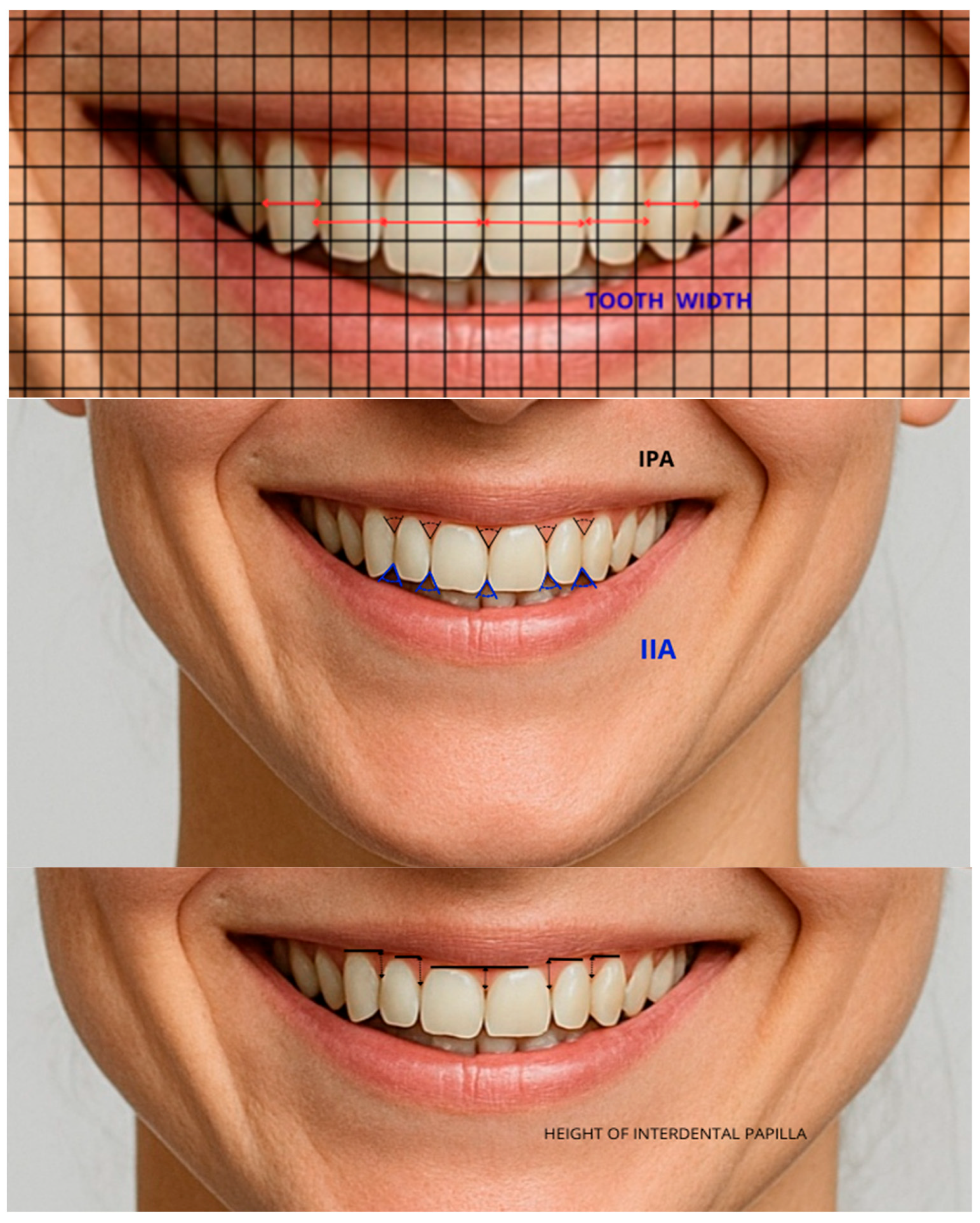 - Kolte, R.A.; Kolte, A.P.; Ikhar, A.S. Gender-Based Evaluation of Positional Variations of Gingival Papilla and Its Proportions: A Clinicoradiographic Study. J. Indian Soc. Periodontol. 2022, 26, 269–274. [Google Scholar] [CrossRef]