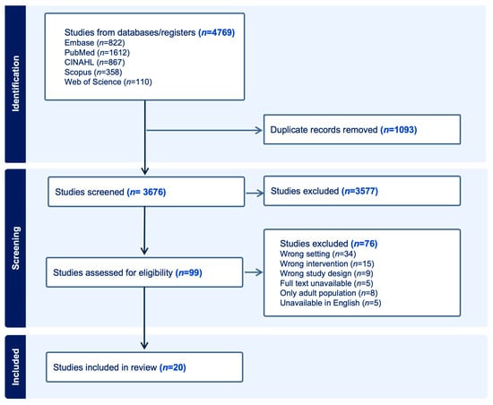 A total of 4769 records were found through database searches. After removing 1093 duplicates, 3676 records remained for title and abstract screening. Of these, 3577 records were excluded based on the predefined eligibility criteria. The full texts of 99 articles were then evaluated for eligibility. Ultimately, 20 studies met the inclusion criteria and were included in the final review (Figure 1).