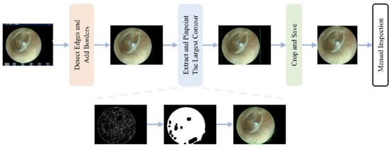 Workflow of the automated interference removal pipeline. The procedure involves four sequential steps: (1) detect edges and add borders to identify the tympanic membrane region; (2) extract and pinpoint the largest contour as the region of interest; (3) crop and save the image; (4) manual inspection of the final result.
