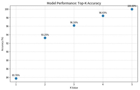 Evaluation of the Top-K diagnostic strategy. The plot illustrates the model’s accuracy as the value of K increases. A Top-2 strategy (K = 2) achieves a balance between high accuracy (93.25%) and clinical practicality by providing a differential diagnosis, which is crucial for decision support in uncertain cases.