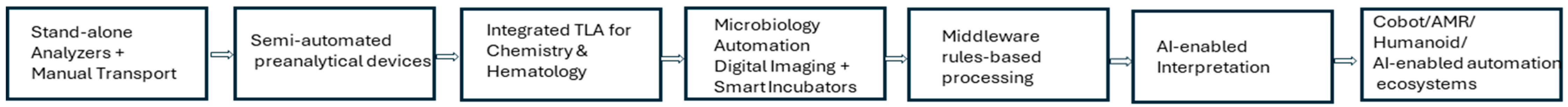 - Islam, S.U.; Kamboj, K.; Kumari, A. Laboratory automation and its effects on workflow effectiveness in medical laboratories. Middle East J. Appl. Sci. Technol. 2023, 6, 88–97. [Google Scholar] [CrossRef]