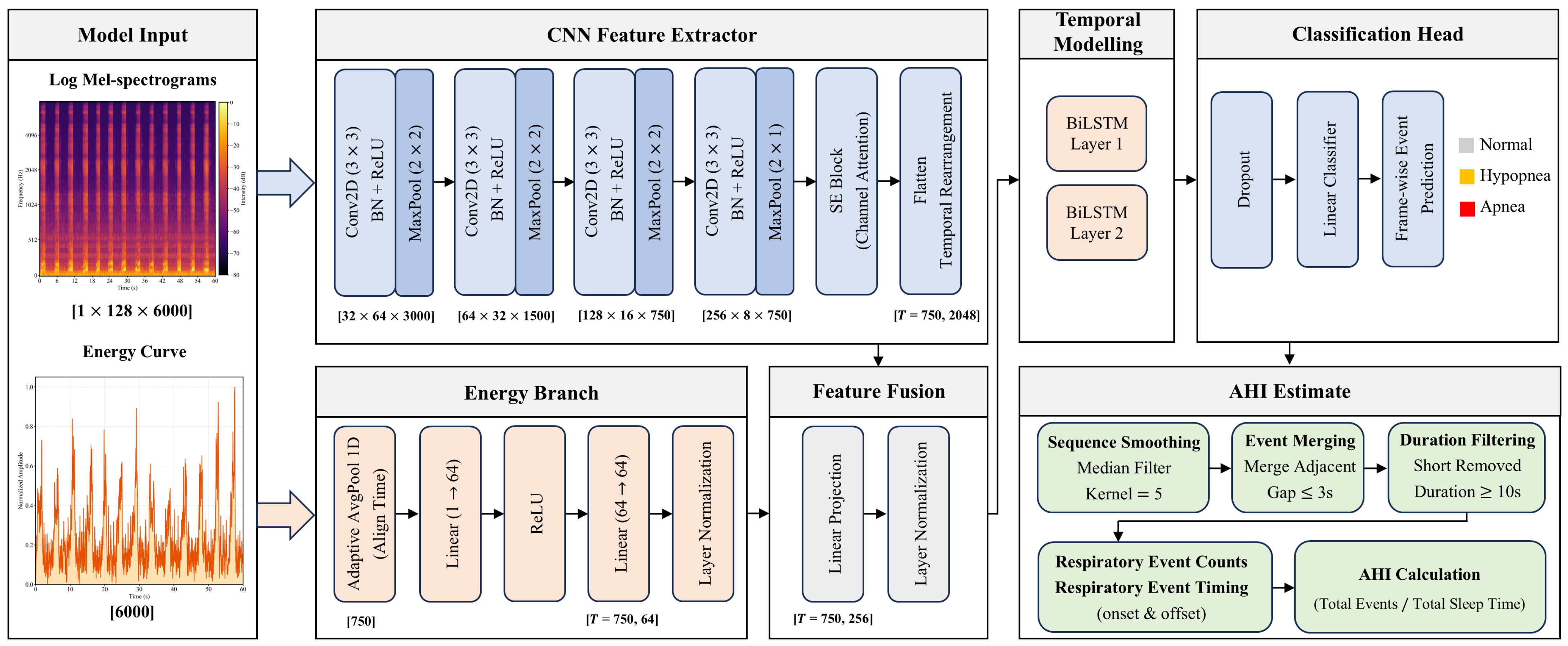 18]. While this approach is efficient for rapid screening, it operates as a “black box,” failing to provide crucial clinical details such as the Apnea-Hypopnea Index (AHI) or the temporal distribution of respiratory events. Second, segment-level analysis divides audio into fixed-duration epochs (e.g., 30 s) to determine the presence of respiratory events within each segment [