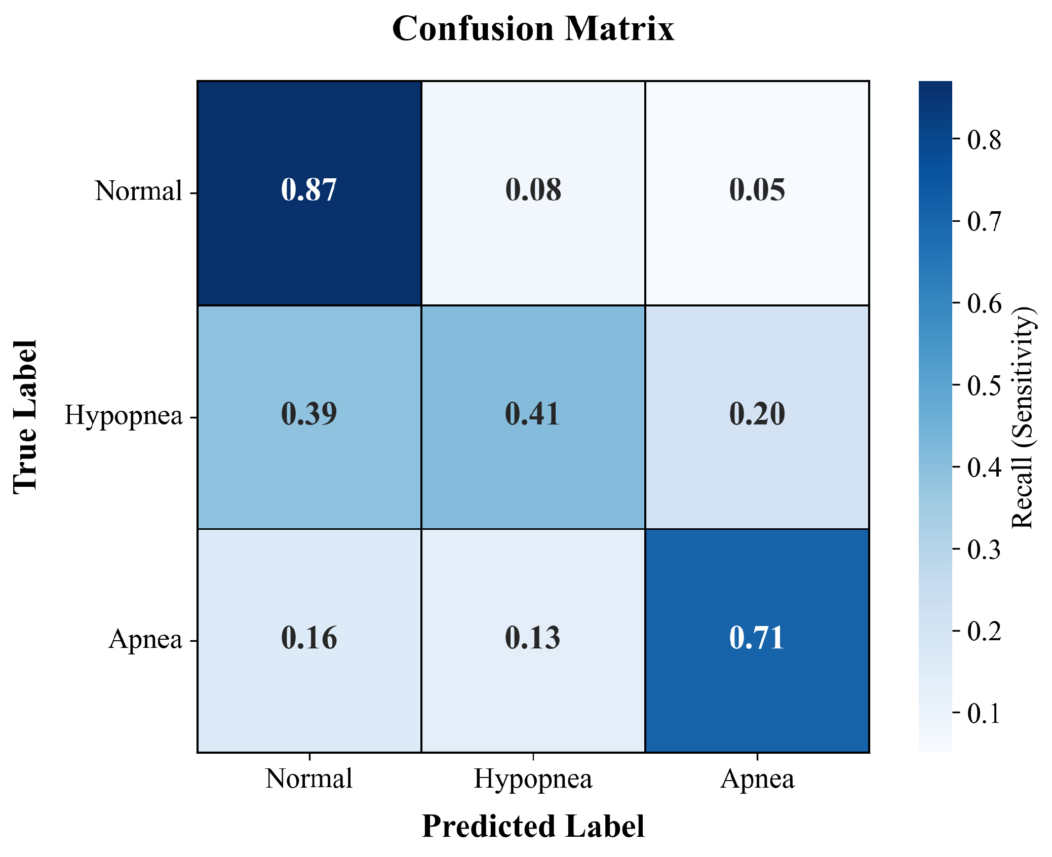 Third, a critical limitation of audio-only screening is the inability to access the multimodal data required for strict AASM compliance. While audio models can detect acoustic variations stemming from airflow limitation, they cannot verify the physiological consequences (≥3% oxygen desaturation or arousal) required for clinical confirmation of hypopnea events. This inherent lack of physiological context leads to false positives, specifically Normal misclassified as Hypopnea (26%), as illustrated in