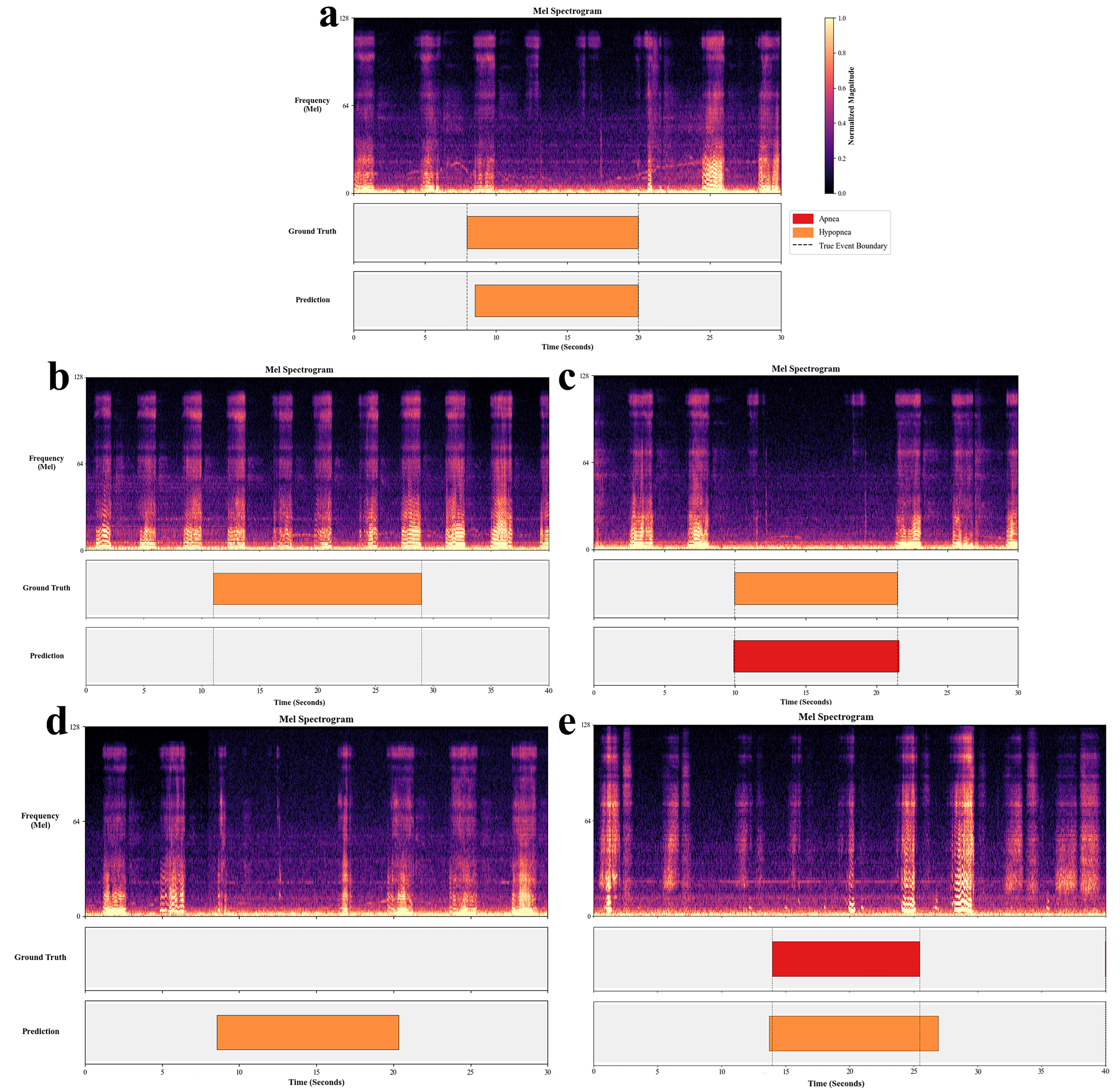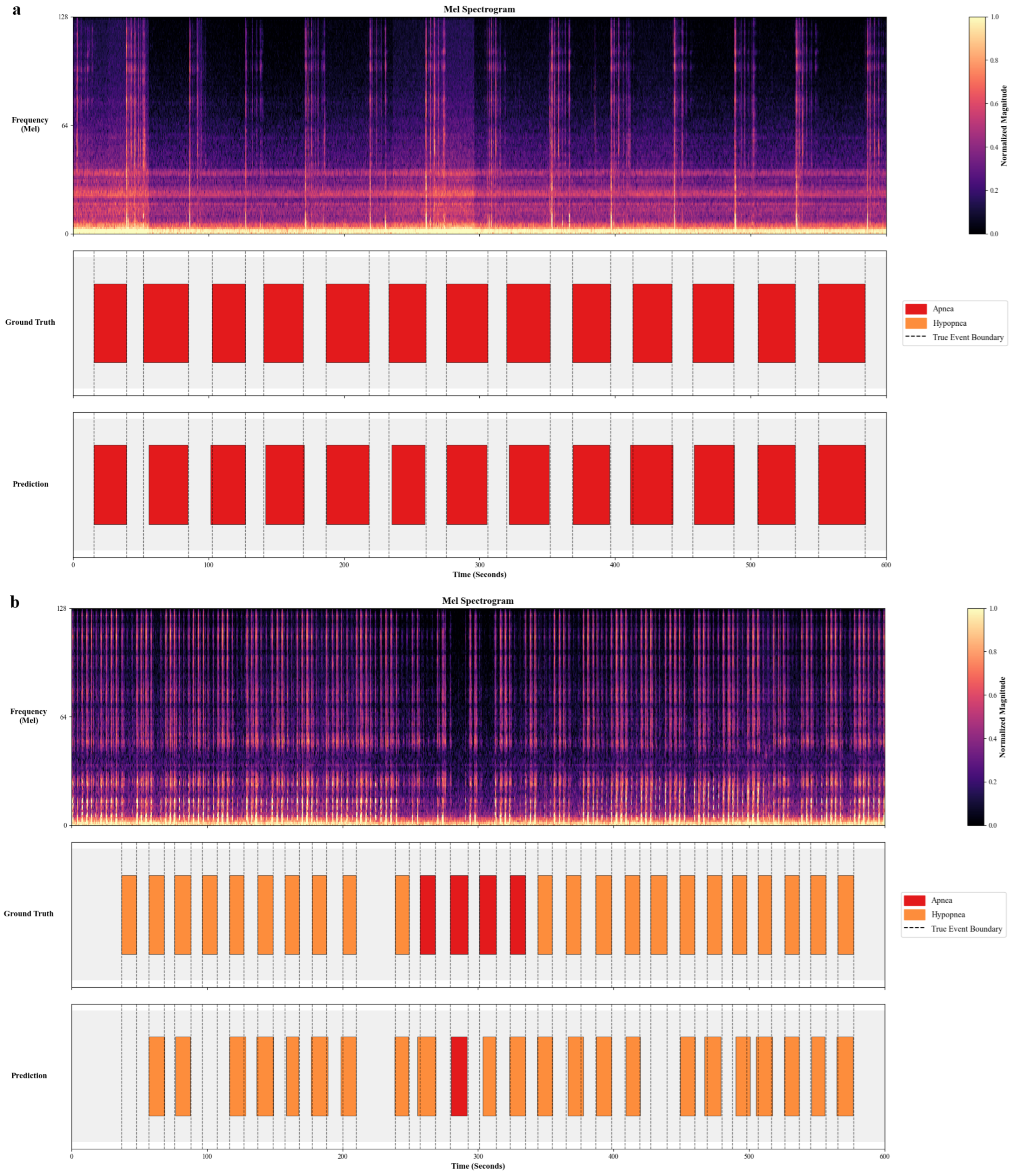 Figure 3a displays a segment dominated by Apnea events. The model achieved precise temporal alignment, accurately delineating the contiguous apnea episodes (red segments) which correspond to silence intervals.