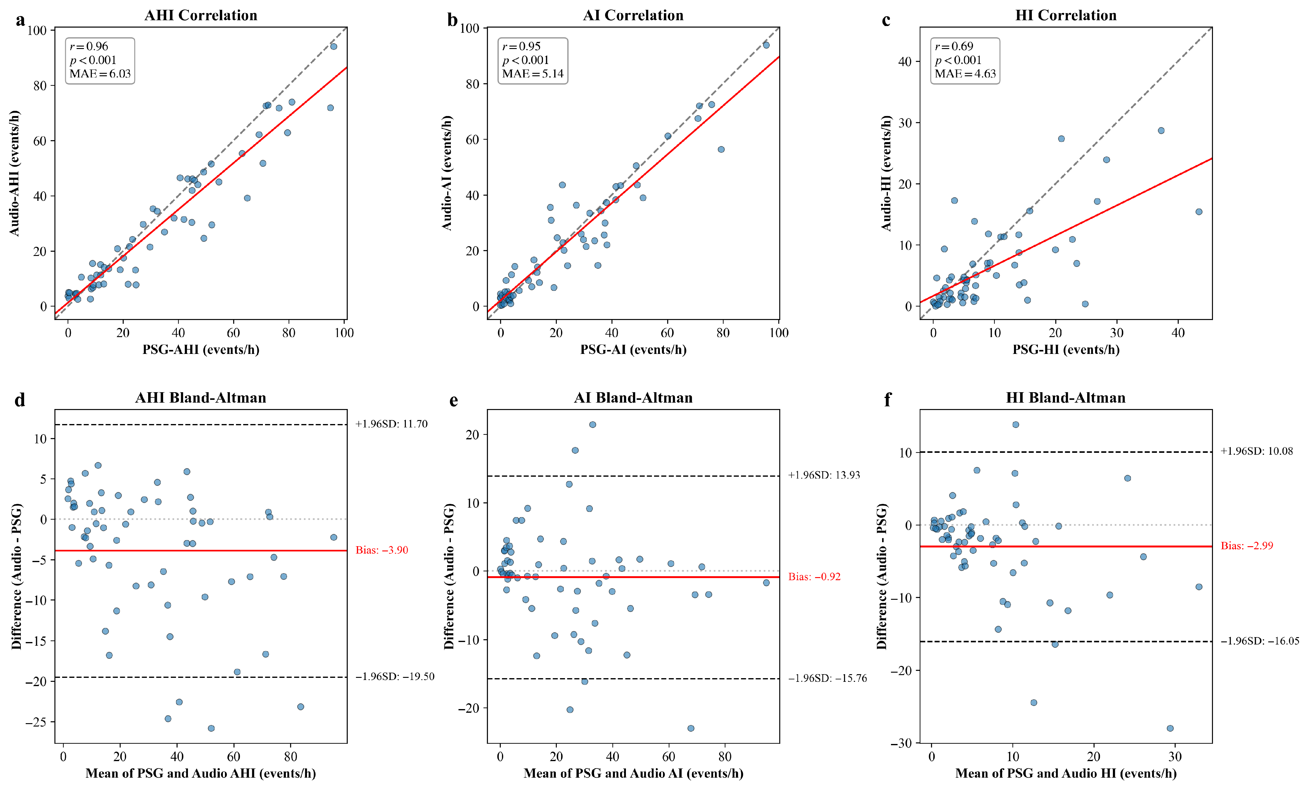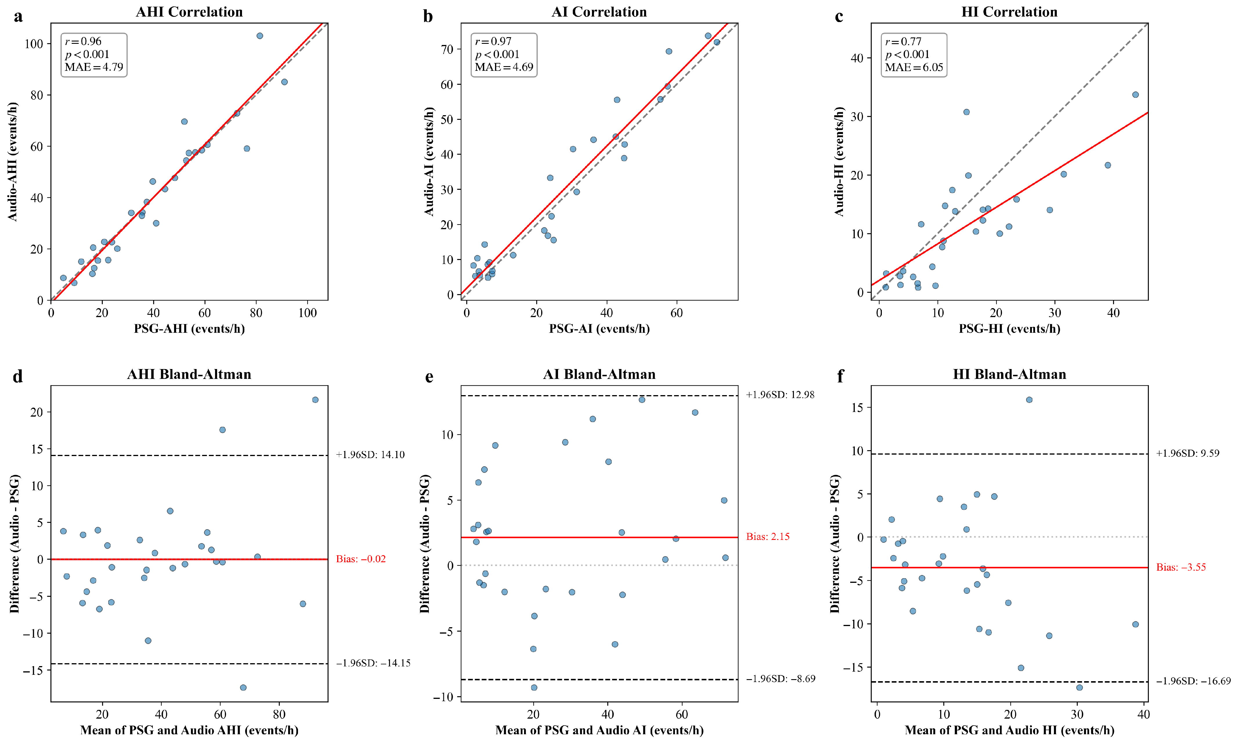 Figure 4 illustrates the agreement between the audio-derived indices and the ground truth PSG indices.