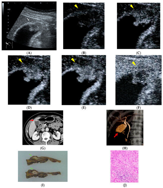 A 66-year-old man with a history of rectal cancer surgery 19 years earlier. During follow-up, a polypoid lesion with a slightly hypoechoic center is detected at the fundus of the gallbladder, accompanied by irregularity of the gallbladder wall ((A), white arrow). On contrast-enhanced ultrasonography (CEUS), the polypoid lesion shows heterogeneous enhancement in the early phase followed by washout ((B), 0 s; (C), 18 s; (D), 19 s; (E), 22 s; (F), 300 s after injection of contrast material, yellow arrowheads). Contrast-enhanced abdominal CT demonstrated an enhancing polypoid lesion at the gallbladder fundus ((G), red arrow). CT cholangiography revealed a filling defect at the gallbladder fundus ((H), red arrow). Histopathological examination revealed gallbladder carcinoma composed of both well-differentiated and poorly differentiated adenocarcinoma components, with partial invasion into the liver bed, corresponding to stage IIIb disease ((I), green arrows; (J)). The patient has remained recurrence-free for 65 months after surgery.