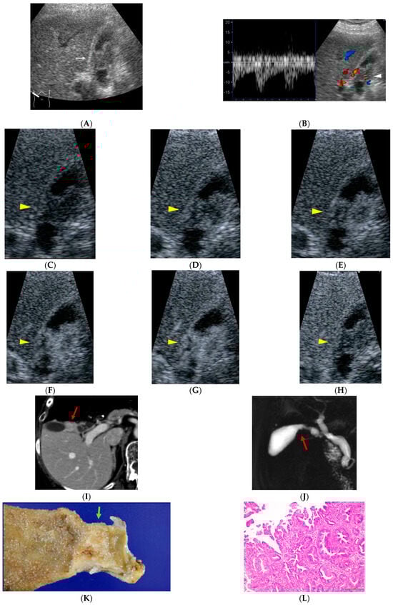 A 77-year-old woman who had been treated for gastric malignant lymphoma 10 years earlier. During evaluation for abdominal pain, diffuse circumferential wall thickening of the gallbladder body is observed ((A), white arrow). Color Doppler ultrasonography demonstrated pulsatile intratumoral blood flow signals ((B), white arrowhead). On CEUS, the lesion shows early heterogeneous enhancement followed by washout ((C), 0: pre-contrast image; (D), 15; (E), 18; (F), 19; (G), 22; (H), 300 s after injection of contrast material, yellow arrow heads). Contrast-enhanced abdominal CT reveals an enhancing mass lesion at the gallbladder neck ((I), red arrow), and MR cholangiopancreatography demonstrates a corresponding filling defect ((J), red arrow). Histopathological examination confirms papillary adenocarcinoma, stage II ((K), green arrow; (L)). The patient remains recurrence-free for 71 months after surgery.