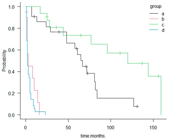 Figure 3. Kaplan–Meier survival curves for groups a–d. Group a: GBC with MPM (+) undergoing surgical resection; Group b: GBC MPM (+) without resection; Group c: GBC MPM (−) undergoing surgical resection; and Group d: GBC MPM (−) without resection. Resected cases (groups a and c) demonstrate significantly longer survival compared with unresected cases (groups b and d).