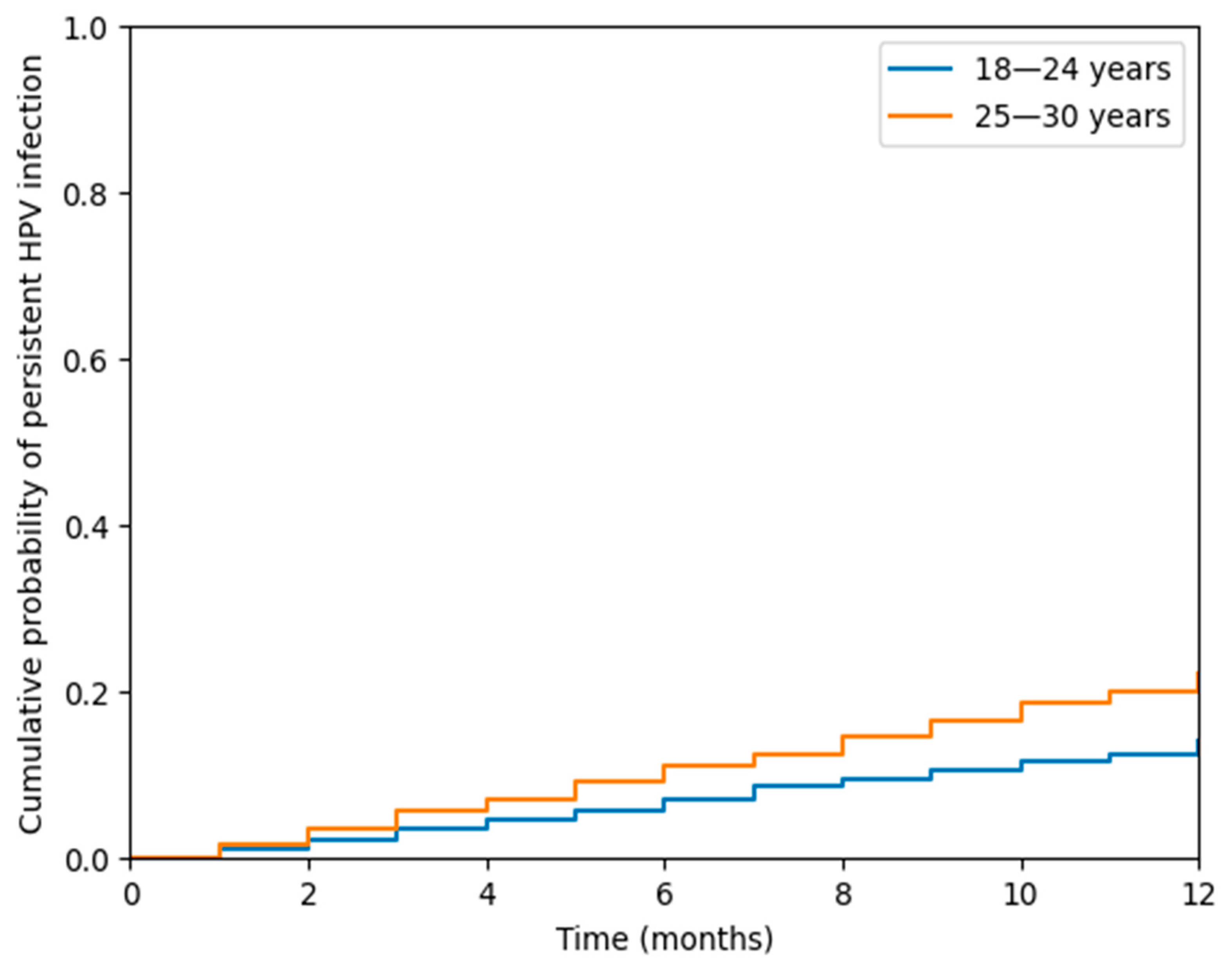 To evaluate differences between the 18–24 and 25–30 age groups, Chi-square (χ2) tests were used for categorical variables. Kaplan–Meier survival analysis was performed to compare 12-month HPV clearance between groups, and the log-rank test was used to assess statistical significance in survival curves.